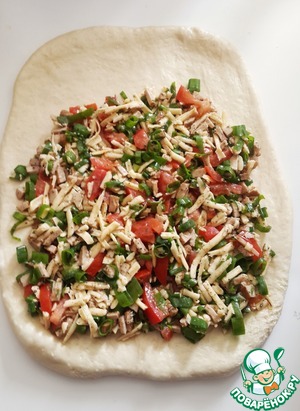 Раскатайте тесто в пласт 0,5 см, разложите начинку, не доходя до одного края 5-8 см