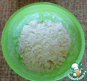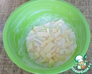 В просеянную муку добавить кусочки маргарина (или сливочного масла) комнатной температуры.