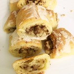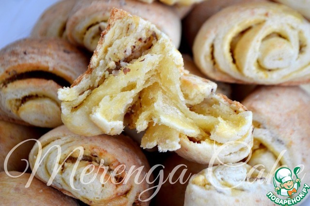 Можно сначала свернуть в рулет, разрезать на кусочки, и потом уже внутрь каждого кусочка положить по орешку.