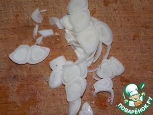 Чеснок нарезать тонкими ломтиками.