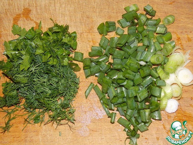 Зелень и лук измельчить.