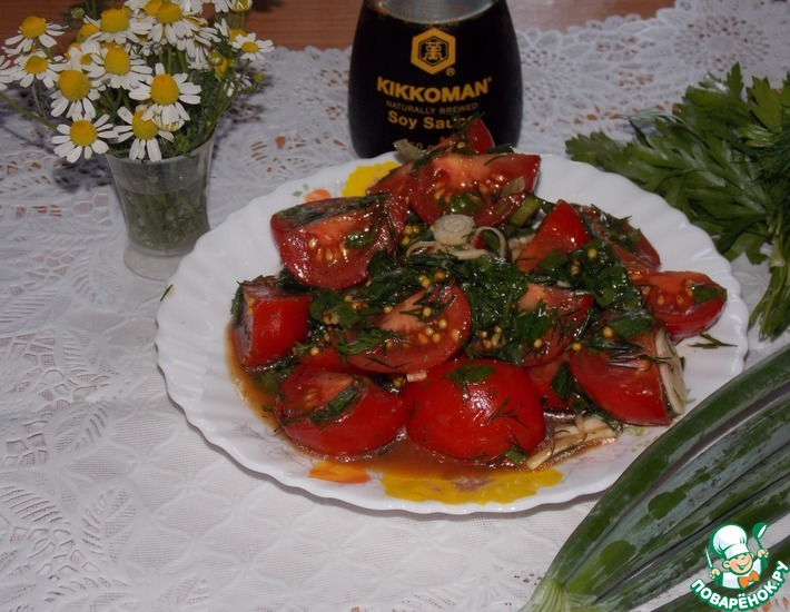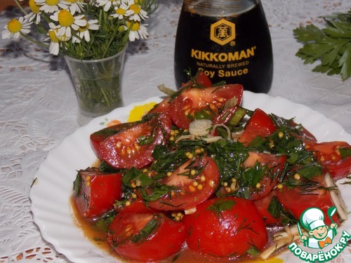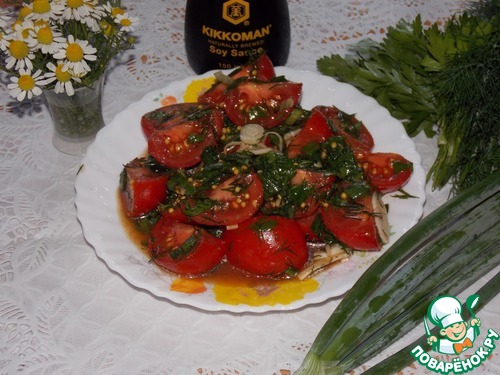 Вылить заправку на помидоры, добавить горчицу и зелень, добавить сахар, соль и перец. Перемешать. Оставить в холодильнике на час. За это время аккуратно перемешать 2-3 раза.