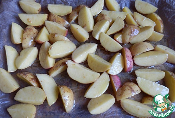 Картошку тщательно вымыть и обсушить, разрезать пополам или на четвертинки.