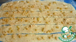 Посыпать смесью из изюма и сахара и разрезать на полоски. -