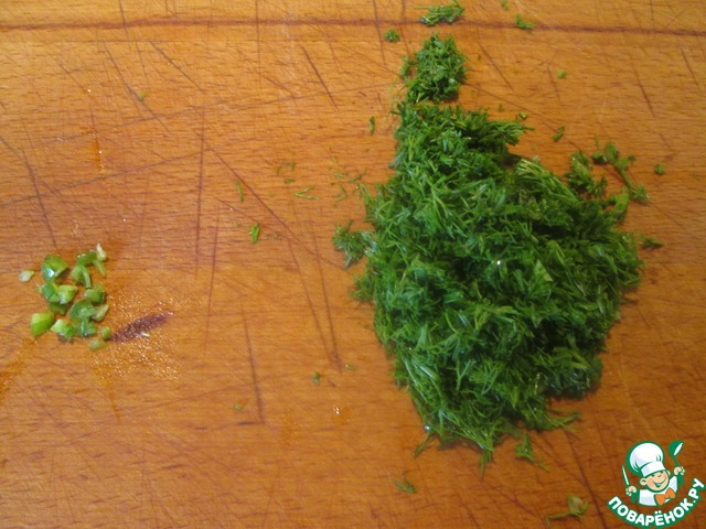 Мелко порезать укроп и маленький кусочек перчика чили.