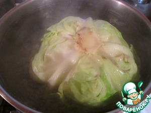 Хочу сразу оговориться, что процесс приготовления не требует присутствия хозяйки в течении всего времени, указанного в строке " время приготовления ". Подготовка и фаршировка займут меньше часа, все остальное время капуста будет вариться. Итак, берем наш кочан капусты и отвариваем в подсоленной воде на среднем огне 10 - 15 минут. В процессе варки один раз нужно кочан перевернуть.
