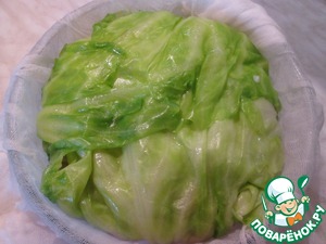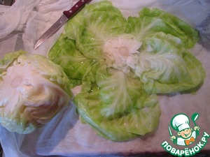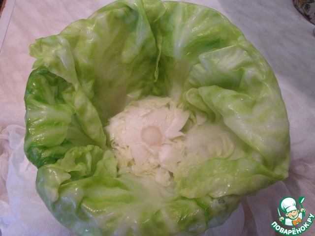 Выложить кочан на марлю и осторожно отвернуть пять внешних листьев. Вырезать твердую середину. На всякий случай от вырезанной части отделить пару листьев. Они могут понадобиться для формирования кочана.