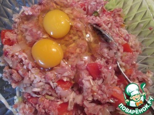 Теперь займемся фаршем. Обжарить лук и бекон. Я использовала свиной фарш, поэтому данный шаг пропустила. Помидоры порезать кусочками средней величины. Смешать фарш, отваренный предварительно рис, порезанные помидоры и лук с беконом, если вы их используете. Мелко нашинковать половину вырезанной из кочана серединки. Посолить, поперчить, добавить 2 - 3 яйца, хорошо вымешать.