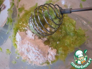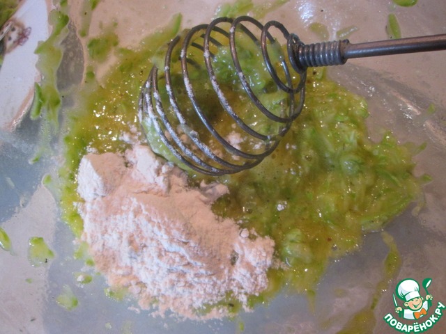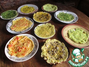Теперь можно приступать к приготовлению омлетов. Заранее подготовьте 10 тарелок, т. к. каждый омлет лучше выкладывать отдельно. Из каждой начинки необходимо сделать по два омлета. На все начинки кроме кабачков у меня ушло по 4 яйца, т. е. по два на каждый омлет. На кабачки ушло всего два яйца. Итак, берем первую начинку ( кабачки ) и делим ее на две равные части. Вбиваем яйцо, солим, перчим и добавляем 1,5 ст. л. муки для плотности. Все хорошо взбиваем венчиком и жарим омлет. То же самое повторяем со второй половиной кабачков.