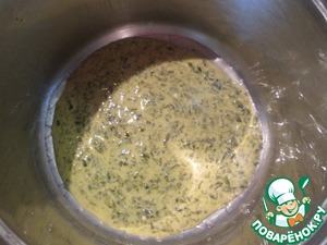 Готовим щавелевую заливку. Разбить 5 яиц, добавить щавелевое пюре, сметану, посолить, поперчить.