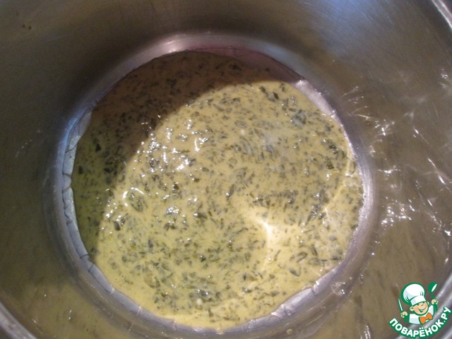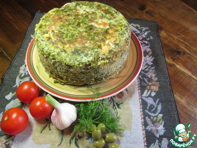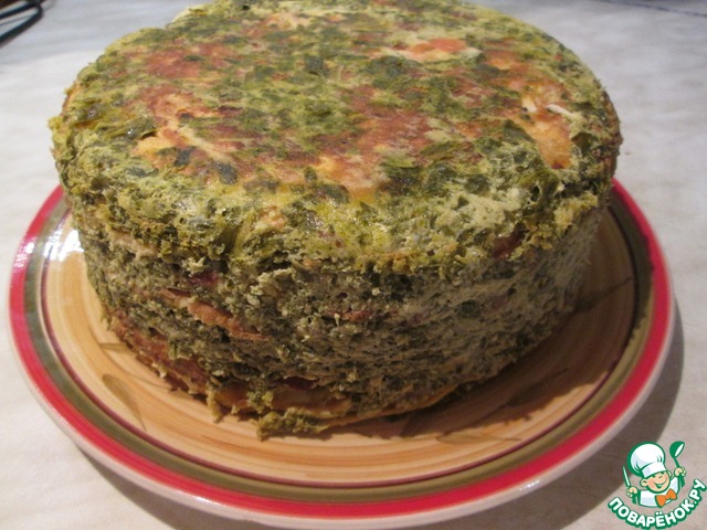 Теперь можно приступать к сборке каравая. Из пекарской бумаги вырезать два круга, диаметром равные дну формы, которая должна быть неразъемной. Я использовала кастрюлю, объемом 3 литра. Форму и круги смазать маслом, положить один круг на дно формы. Вылить на него небольшой половник щавелевого соуса и уложить омлеты, чередуя вкусы и цвет и выливая на каждый омлет небольшое количество соуса. У меня получилось так: зелень, оливки, грибы, кабачки, помидоры и перец. Оставшиеся омлеты укладываем в той же последовательности. На последний омлет выливаем оставшийся соус, укладываем второй круг промасленной бумаги. Выпекать каравай в разогретой до 180 градусов духовке 45 минут. Полностью остудить. Если после выпечки каравай вздуется и будет неровным, не волнуйтесь - после остывания все станет на свои места. Освободить каравай от бумаги, провести ножом по бокам формы, накрыть ее сервировочной тарелкой и перевернуть.