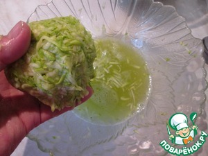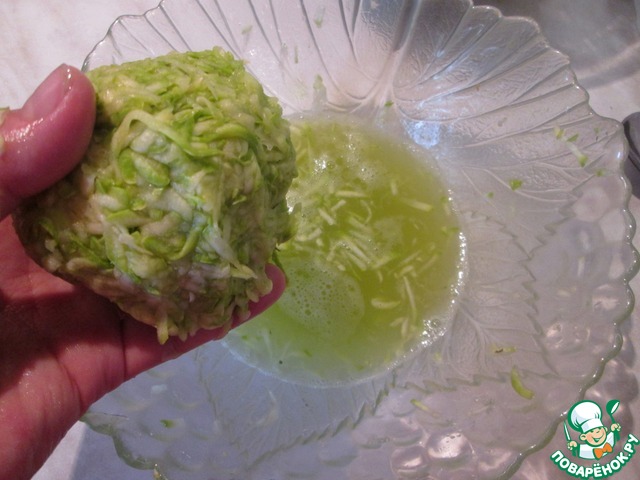 Сначала нужно подготовить начинки. Кабачки натереть на крупной терке, посолить, оставить на 30 минут. Затем собрать массу в комок и отжать как можно больше жидкости. Жарить кабачки в небольшом количестве растительного масла на среднем огне 6-7 минут.