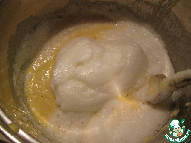 После подъема тесто вымешать, посолить. Яйца разделить, желтки растереть с сахаром, добавить в опару. Добавить растопленное сливочное масло, орехи и цедру, если вы их используете, и взбитые до мягких пиков белки. Все хорошо перемешать.