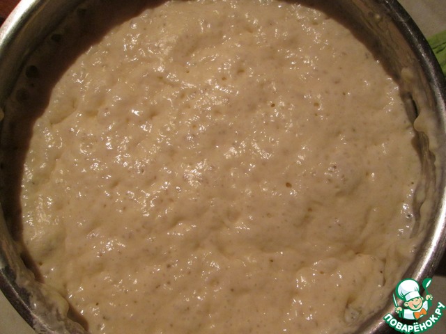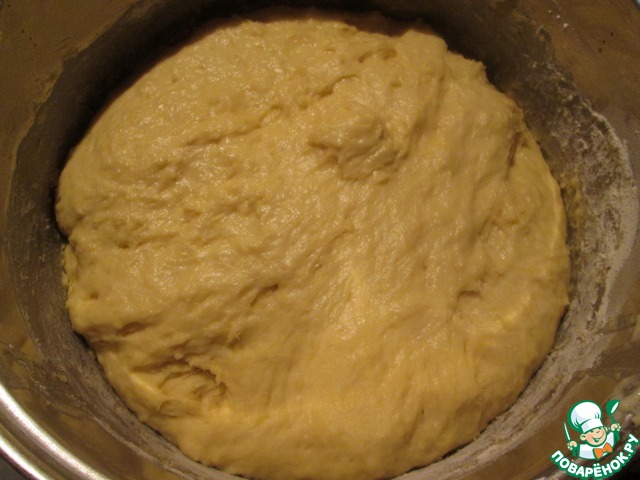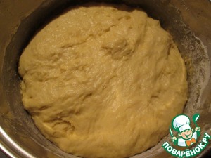 В 1/3 стакана теплого молока развести дрожжи, добавить к заварной основе, тщательно размешать и дать подняться в теплом месте.