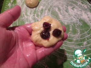 После того, как тесто подошло, а жир вытопился и разогрелся, начинаем формировать пончики. Для этого нужно смазать руки растительным маслом, отщипнуть небольшой кусочек теста, растянуть в небольшую лепешечку и положить начинку. У меня было вишневое варенье, которое я заранее откинула на дуршлаг, чтобы стек сироп.