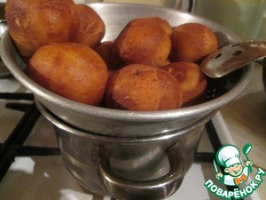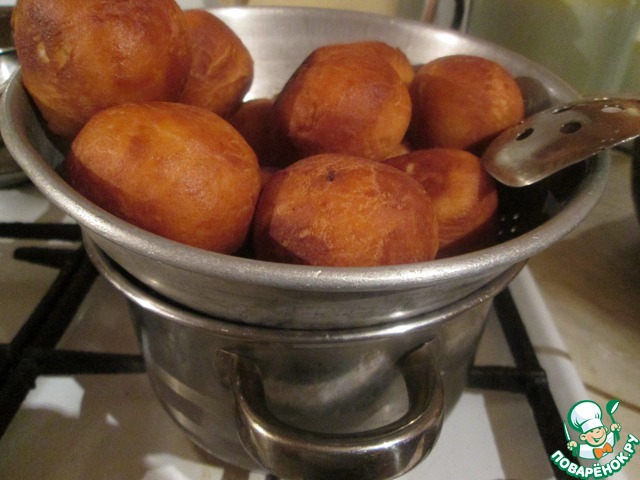 Пончики я выкладывала на дуршлаг, который поставила на подходящую по размеру кастрюлю, чтобы стекал лишний жир.