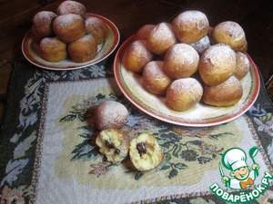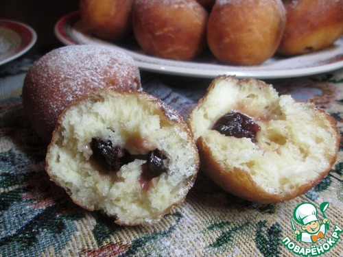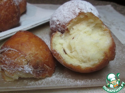 Готовые пончики остудить, присыпать сахарной пудрой и подавать к столу!