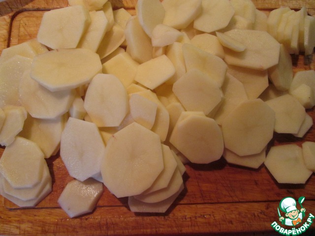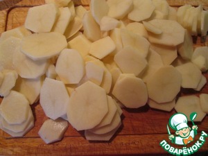 Сначала нужно подготовить овощи: картофель почистить, порезать кружочками толщиной 3 мм.