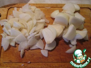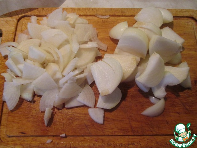 Две луковицы порезать дольками, как апельсин, а остальные - тоненько. Порезанный лук и картошку положить в холодную воду.