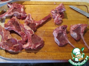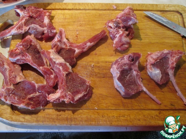 Теперь займемся мясом. С ребрышек нужно срезать все, что не относится к куску для подачи. Косточку необходимо зачистить ножом, так она красиво будет выглядеть на тарелке.