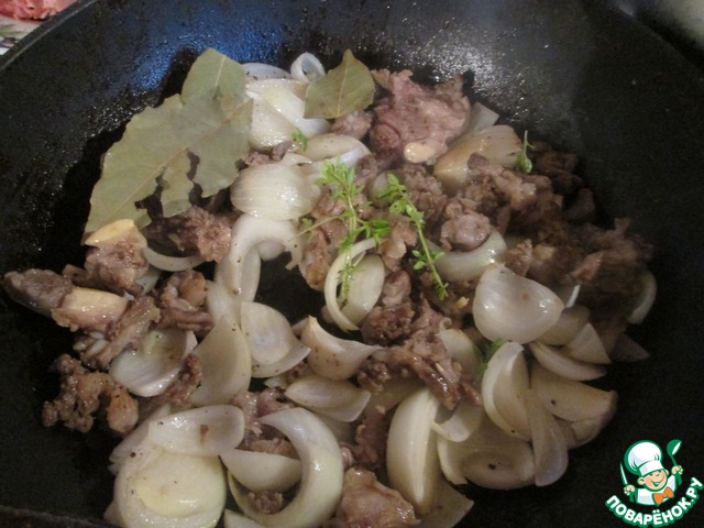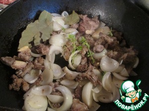 Все обрезки обжариваем в глубокой сковороде с небольшим количеством масла. Когда кусочки станут зажаристыми, слить лишний жир и добавить лук, порезанный дольками, чеснок, его достаточно раздавить плоской стороной ножа, тимьян и лавровый лист. Обжарить еще немного и добавить куриный бульон, совсем чуть - чуть. Убавить огонь.