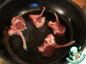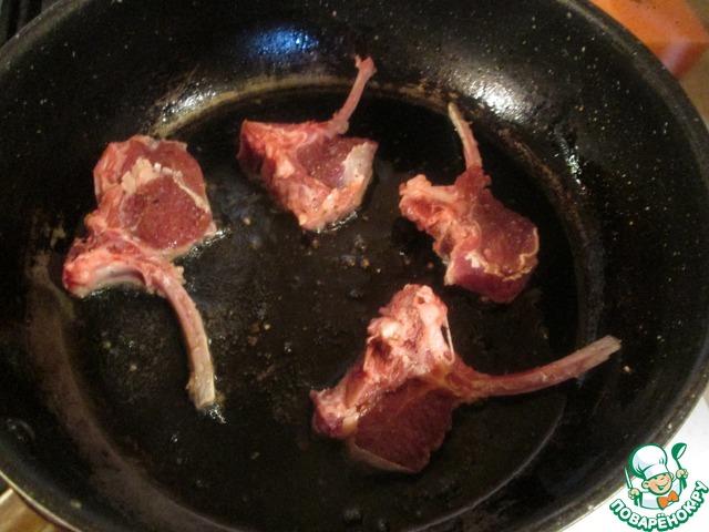 На другой сковороде жарим ребра, посолив и поперчив их, до золотистой корочки.