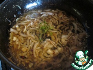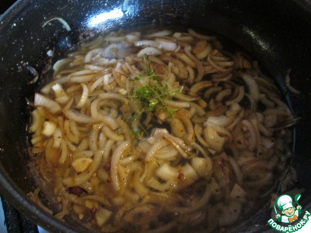 В сковороду из - под ребер кладем мелко порезанный лук. Солим, перчим, добавляем тимьян, немного бульона и тушим до мягкости.