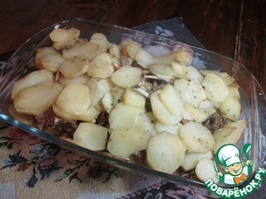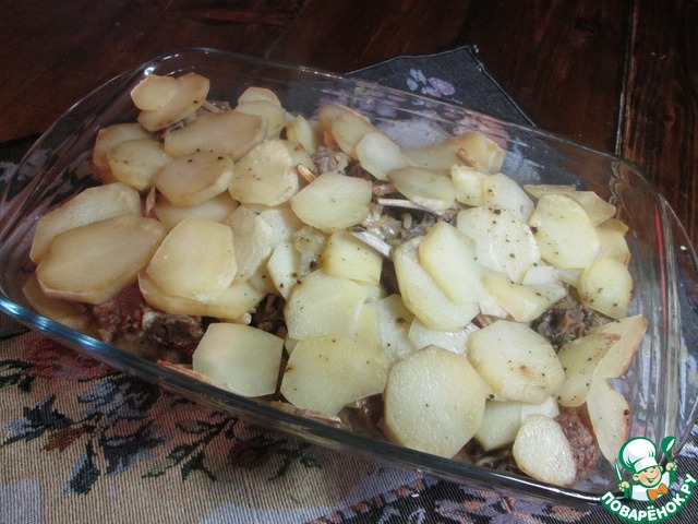 Теперь пора соединить все компоненты. На дно формы кладем половину картошки, на нее половину тушеного лука, затем ребра, оставшийся лук и вторую половину картошки. Верхний слой посолить и поперчить, залить бульоном доверху, укутать фольгой и отправить в духовку. Запекать при 120 градусах минимум два часа, лучше три. За 10 минут до окончания снять фольгу, чтобы верх подрумянился.
