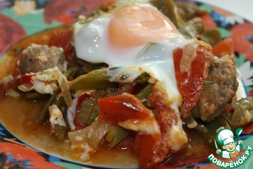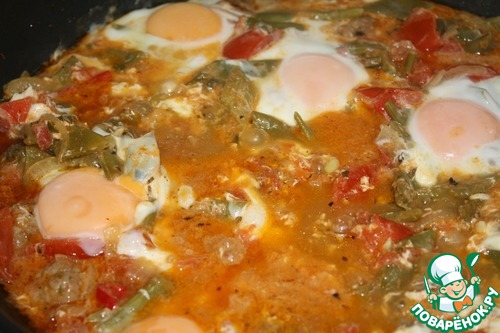 Накатать маленькие фрикадельки кофте. Стручковую фасоль нарезать на брусочки и отварить 6 минут в подсоленой воде до полуготовности. Затем слить воду и отставить пока. Нарезать лук полукольцами, чеснок и перец чили меленько. Если боитесь остроты, то семечки из перца удалить вместе с пререгородками. Помидоры нарезать произвольно, но не крупно. Налить на сковороду масло и обжарить фрикадельки. Затем вынимаем фрикадельки и обжариваем лук, чеснок и перец. Посыпать на лук сахар, это придаст вкус и обжариваться будет быстрее. Так же добавляем черный перец, я кладу почти столовую ложку, но это дело вкуса и начинаем подсыпать травки всякие. При жарке их аромат лучше открывается. Затем идут помидоры. Не забываем постоянно перемешивать, т. к. все идет при сильном огне. Как помидоры помягчеют и дадут много сока, добавить фасоль и фрикадельки, убавить огонь, закрыть крышкой и тушить минут 15. Затем вбить яйца и под крышкой держать минут 8. Белки должны схватиться, а желтки остаться жидкими внутри. Фото в процессе готовки.