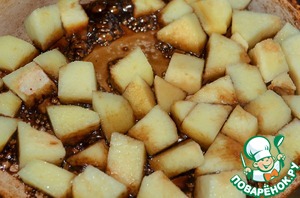 Айву вымыть, почистить, удалить сердцевину, нарезать мелким кубиком ( 2 * 2 см.), обжарить в 1 ст. л. соевого соуса 2 - 3 минуты.