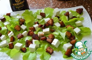 Разложить на большом блюде. "Фетаксу" нарезать аналогичными кубиками, 2/3 выложить на листья салата, добавить остывшую айву. -