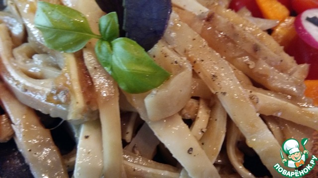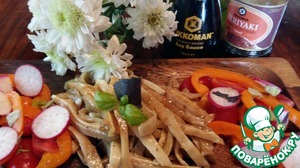 Помидорки черри порезать пополам, сладкий перец тонкой соломкой, редиску кружочками. Ни солить, ни приправлять овощи не надо. Их натуральный вкус будет прекрасно сочетаться с пикантным вкусом маринованных ушек. Ушки нарезать тонкой соломкой, добавить мелко нарезанный зубчик чеснока и заправить соевым соусом ТМ "Киккоман".