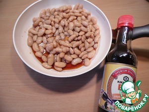 Из фасоли слить жидкость, чеснок измельчить, выложить в сковородку, смазанную растительным маслом, добавить соевый соус и винный уксус, тушить, помешивая, до выпаривания жидкости.