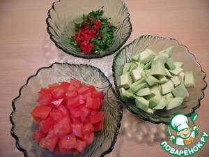 Помидоры (вычистив семена) и авокадо нарезать кубиками, авокадо залить лимонным соком.
