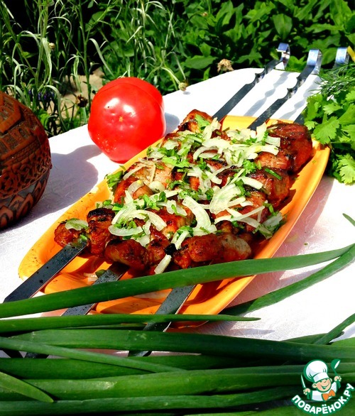 Готовый шашлык выложить на тарелку и посыпать подготовленным луком.