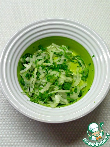 Репчатый лук очистить, порезать тонкими полукольцами. Кинзу вымыть, стряхнуть воду и нарезать. Смешать кинзу с луком.