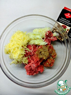 Фарш можно приготовить самим или взять готовый. Лук очистить от шелухи, измельчить на блендере или на терке. Картофель очистить и натереть на мелкой терке. Добавить специи и вымешать фарш. Добавить минералку и тщательно отбить фарш.