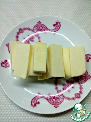 Сыр порезать на брусочки. Можно использовать любой сыр, главное чтобы плавился. Я взяла "Абхазский".