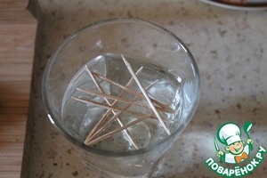 Зубочистки замочить в воде на 15 минут, чтобы они не сгорели во время приготовления на огне.