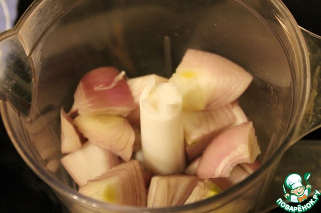 Лук и чеснок измельчить в кашицу с помощью блендера.