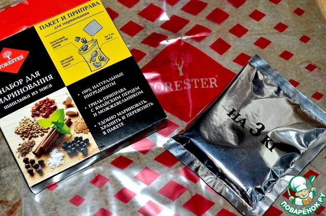 Для этого шашлыка я буду использовать набор фирмы forester. В него входят специи и пакет для маринования. Это очень удобно т. к в пакете шашлык быстрее замаринуется и не нужно искать дополнительно емкость для него.