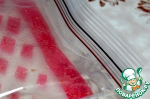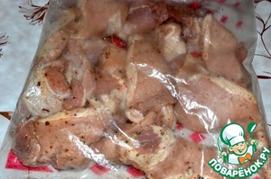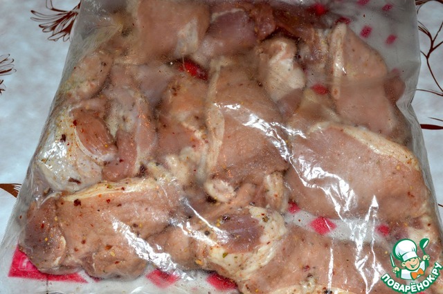 Куски вырезки укладываем в пакет и насыпаем туда специи. Пакет закрываем и тряся его хорошо перешиваем содержимое. Оставляем мариноваться на 15 минут.