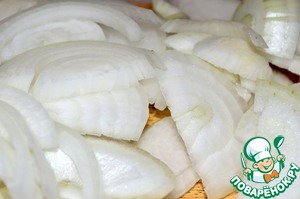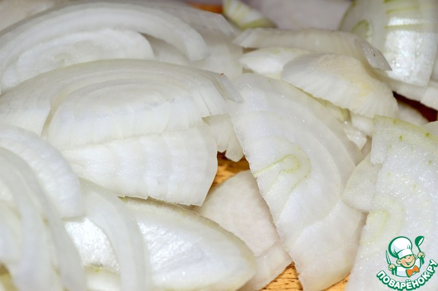 Лук режем полукольцами и немного мнем его руками чтобы он дал сок.