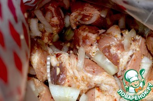Лук и чеснок добавляем к мясу, снова закрываем пакет и перемешиваем. Оставляем мариноваться мясо 3-4 часа.