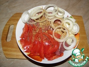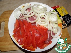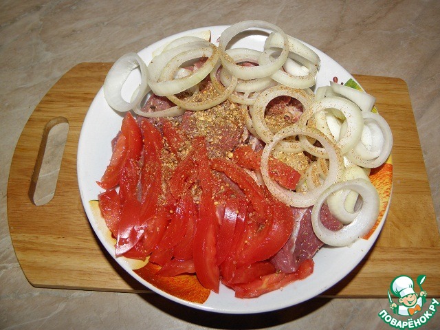 Лук нарезать кольцами, помидоры полосками. Соединить с мясом.
