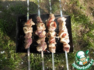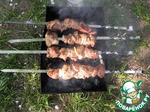 Жарить шашлык над горячими углями без пламени. Регулярно поворачивать шампуры, и поливать минеральной водой. Желательно основную часть струи воды направлять между шампурами.