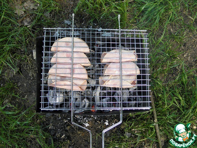 Удалить шпажки, и обжарить на мангале, жар должен быть средним.