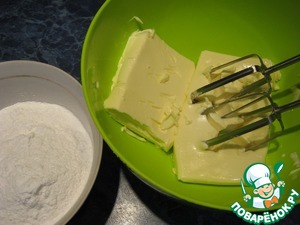 Взбить мягкое сливочное масло, постепенно добавлять сахарную пудру по столовой ложке, продолжая взбивание.