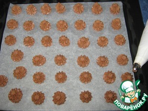 Переложить тесто в кулинарный мешок и отсадить печенье на противень, застеленный пергаментом. Выпекать 8-10 минут при 200 градусах, ориентируясь на свою духовку.