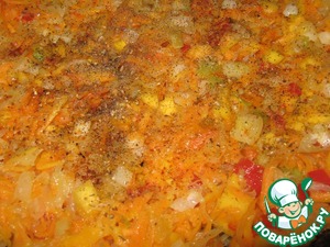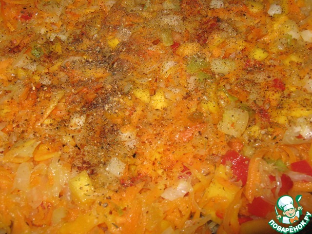 Капусту, лук, морковь, перец, тыкву обжарить на растительном масле. Добавить соль, специи. Остудить.